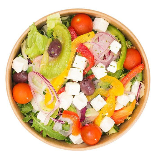 Eine harmonische Kombination aus frischem Blattsalat, Feta, Paprika, Gurke, Kalamata Olive und roter Zwiebel. 1 Porti...