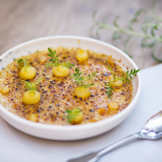 - CREME BRULEE abgebrannt mir braunem Rohrzucker, Beerenragout und Cassissorbert