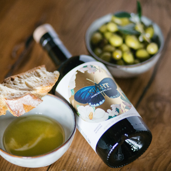 Auf dem Etikett des preisgekrönten Olivenöls Night ist ein Originalölgemälde von Cabello Mure abgebildet. Es zeigt den Schmetterling als einen der beiden Haupt-Protagoisten des ökologischen Projekts und der Qualität der Olivenhaine von Nobleza del Sur. Der zweite Protagonist, die Biene, wird auf dem Olivenöls Day dargestellt. Seit 1640 werden in Nobleza del Sur in der 12. Generation die Liebe zum Land, die Leidenschaft und die Beständigkeit für die edlen und mythischen Olivenbäume nach alter Familientradition gelebt und umgesetzt. Das Olivenöl Night ist die ideale Wahl für Bruschetta, gegrilltes Gemüse, Salate und Pastagerichte.