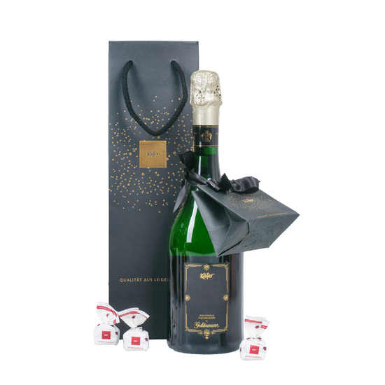 Manchmal braucht es nicht viele Worte, um große Freude zu bereiten: „Eine Tüte Dankeschön“ sagt mit prickelnder Eleganz und süßem Genuss alles. Dieses liebevoll zusammengestellte Präsent vereint feinen Käfer-Sekt mit köstlichen Tartufi und sorgt schon beim Überreichen für Begeisterung. Ideal für Kollegen, Freunde oder jeden besonderen Menschen, dem Sie von Herzen danken möchten.