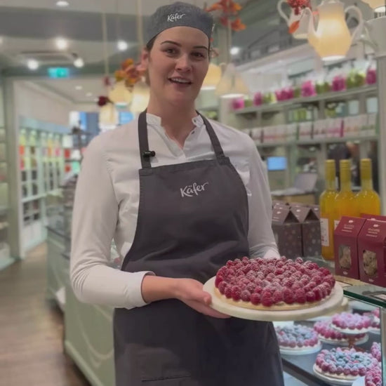 Ein Meisterstück unserer Käfer Konditoren! Die Himbeertarte besteht aus einem luftigen Mürbeteigboden, der mit einer dünnen Schicht weißer Kuvertüre überzogen ist. Nur so kann verhindert werden, dass der Tortenboden durchweicht. Anschließend wird die Tarte mit einer süßen Cremeschicht mit Vanillearoma bestrichen und mit den schönsten Himbeeren der Stadt belegt. Und das schon um 4 Uhr morgens, damit nicht nur in unserem Stammhaus, sondern auch in unseren Delis immer frische Himbeertartes gibt. Das i-Tüpfelchen zum Schluss ist ein spezieller Puderzucker zum Bestäuben, denn nur er behält lange seine weiße Farbe. Perfekt auch als Geburtstagshighlight oder zu Kaffee und Kuchen.