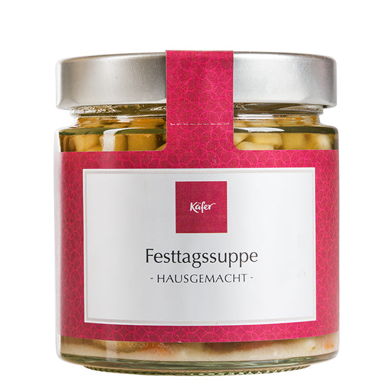 Mit unserer Käfer Festtagssuppe zaubern Sie schnell und ohne großen Aufwand ein gesundes und leckeres Gericht auf Ihren Teller. Die Suppe, die mit würziger Bouillon, Markklößchen, Maultaschen und Grießnockerl eine bunte kuliarische Vielfalt enthält, ist als Vorspeise zu vielen Festagsmenüs ein beliebter und gern gesehener Klassiker. Die Suppe muss nur kurz im Topf oder in der Mikrowelle erwärmt werden.