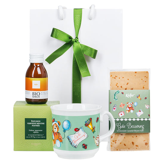 - ein Haferl „Gute Besserung“ – hochwertiges Haferl mit liebevoller Botschaft und dekorativem Design,