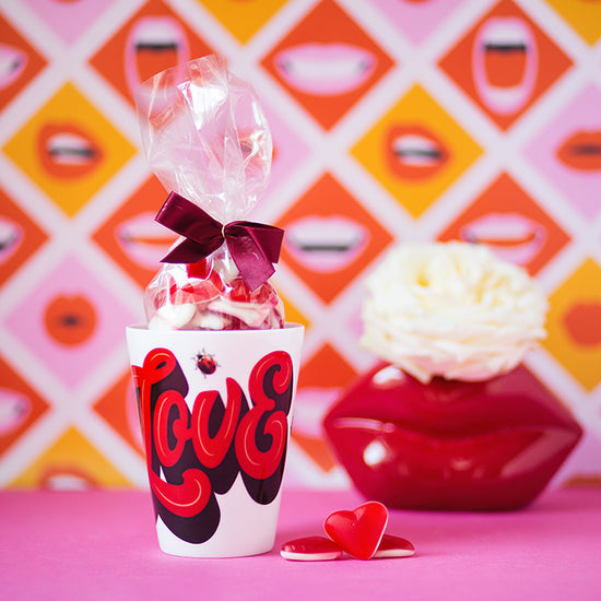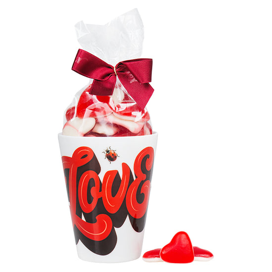 Doch dieses Haferl ist nicht nur hübsch, sondern auch genussvoll gefüllt: Im Inneren warten rote Fruchtgummi-Herzen, die mit ihrer fruchtigen Note und der verspielten Form perfekt zur Botschaft passen. Ob als Mitbringsel, kleines Dankeschön, Überraschung für Lieblingsmenschen oder als süßer Tischgruß – es trifft immer den richtigen Ton.