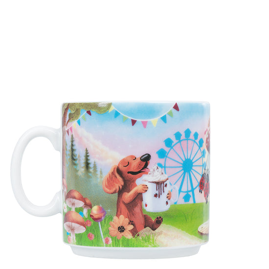 Kunterbunt, voller Leben und mit einem Hauch Magie – dieses liebevoll gestaltete Kinder-Haferl ist eine fantasievolle Hommage an den ersten Wiesn-Moment. Inspiriert von einem Tag im Schlaraffenland erzählt das Motiv von einer Welt, in der alles möglich scheint: Karussell und Achterbahn drehen sich munter, das Riesenrad ragt in den Himmel und mittendrin flitzt der fröhliche Dackel Loisl durch das Gewusel. Überall warten süße Versuchungen – Lebkuchenherzen, Zuckerstangen und bunte Luftballons –, eingebettet in eine Szenerie voller Staunen und Entdeckungen. Dieses Haferl entführt in ein kleines Wiesn-Wunderland, das Kindern wie Erwachsenen ein Lächeln ins Gesicht zaubert. Ein Geschenk mit Herz für kleine Wiesn-Beginners, das die verspielte Seite der Wiesn liebevoll einfängt. Bestellen Sie jetzt und zaubern Sie ein Stück Magie in Kinderaugen. .