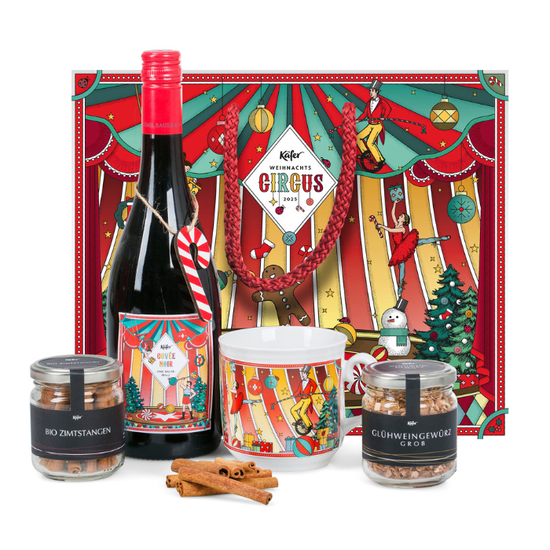 „Winter Varieté“ ist ein liebevoll arrangiertes Weihnachtspräsent, das mit wenigen, aber besonderen Elementen für festliche Stimmung sorgt. Die Kombination aus dekorativen Akzenten, wärmenden Aromen und einer festlich etikettierten Flasche Rotwein macht es zur idealen Geschenkidee für Kunden, Kollegen oder Freunde.